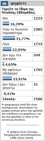 Όχι ότι μας λέει πολλά μια μίνι-δημοσκόπηση του in.gr, αλλά για όσους παρακολουθούν την εκκοσμίκευση της ελληνικής κοινωνίας, ας ρίξουν εδώ μια ματιά (αποθήκευση 17 Απριλίου):